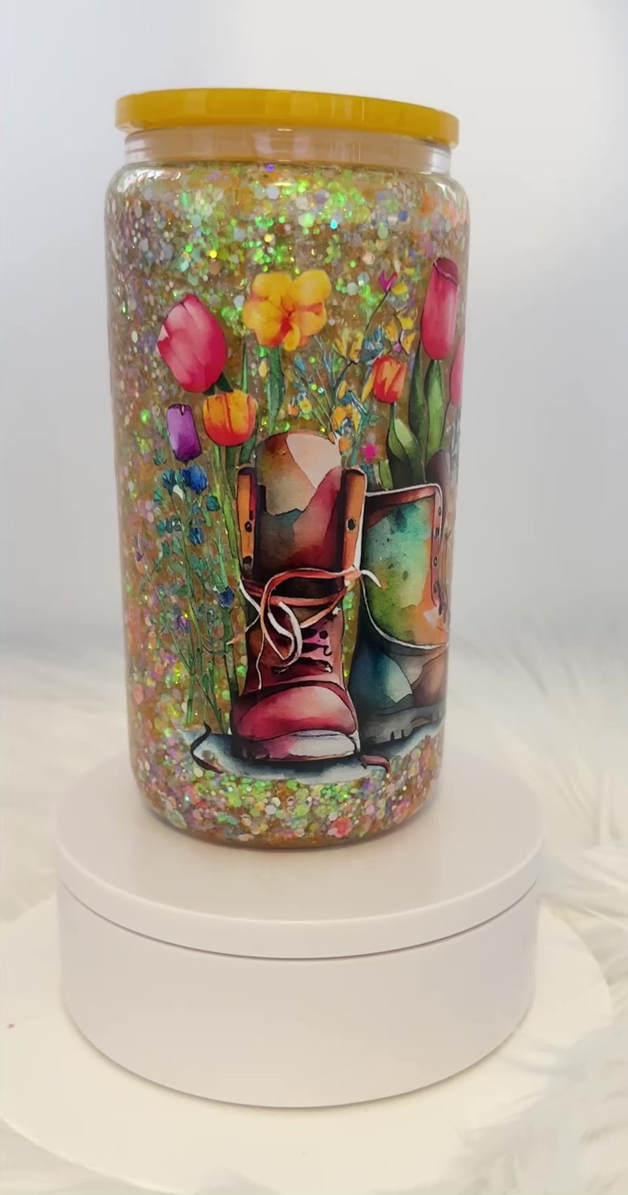 This listing is for a 16 ounce glass snow globe tumbler with lid and straw.